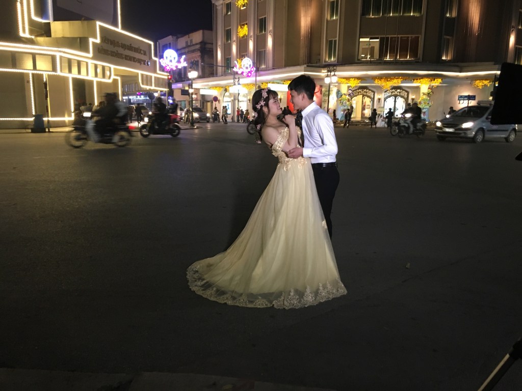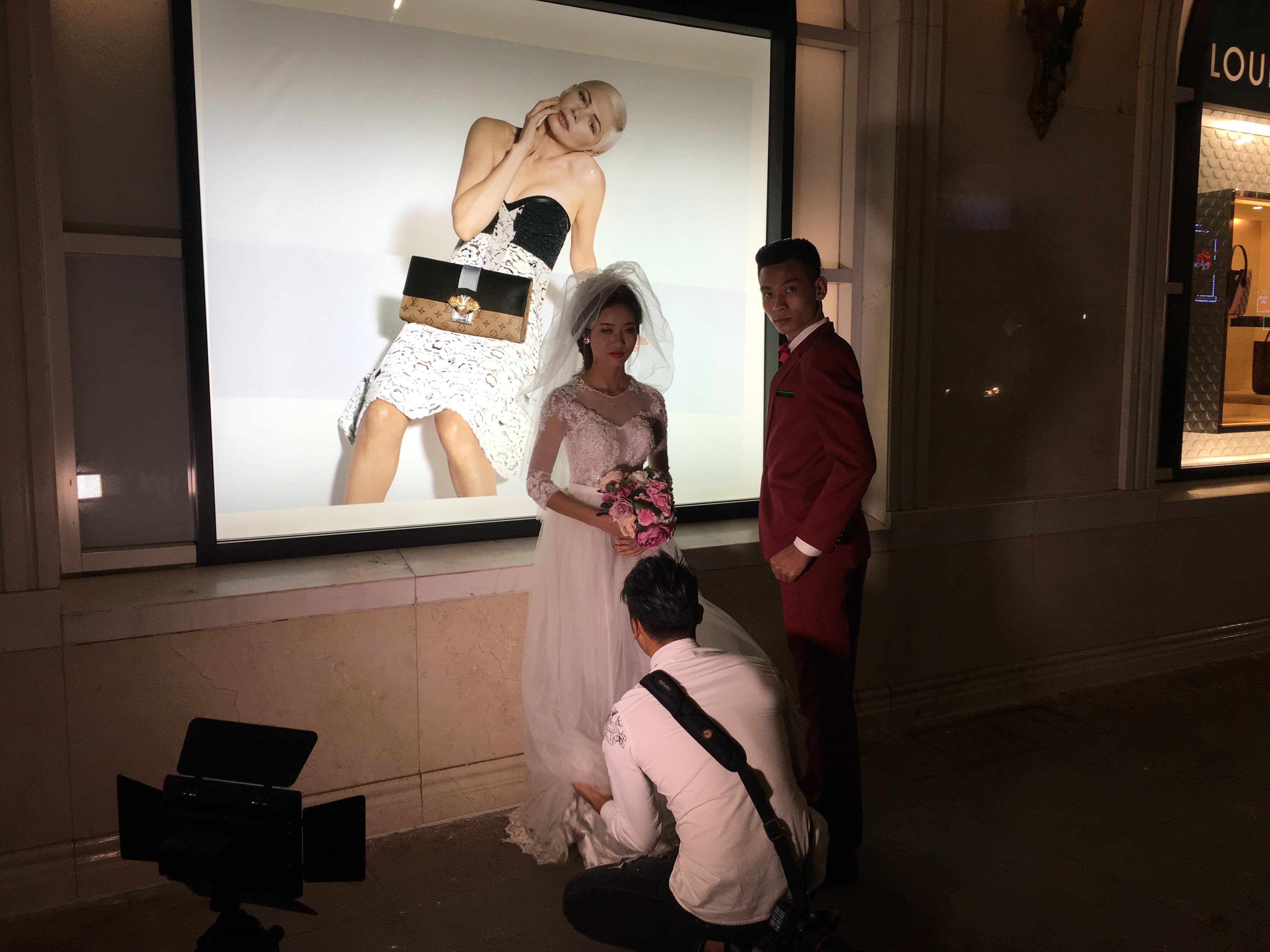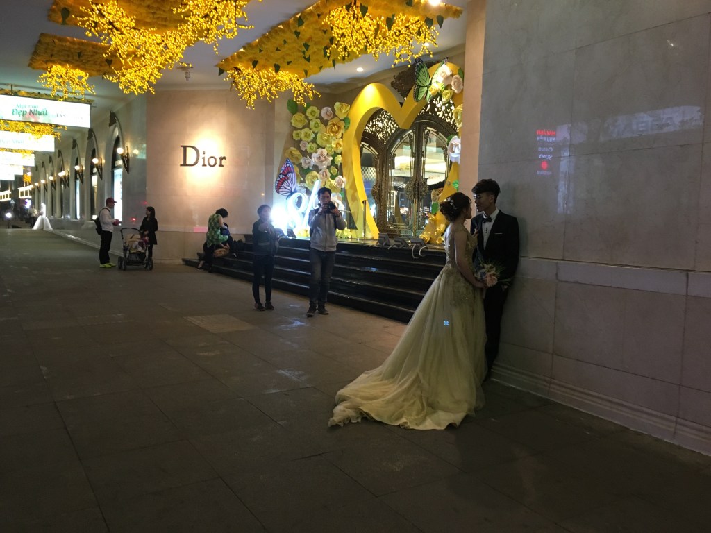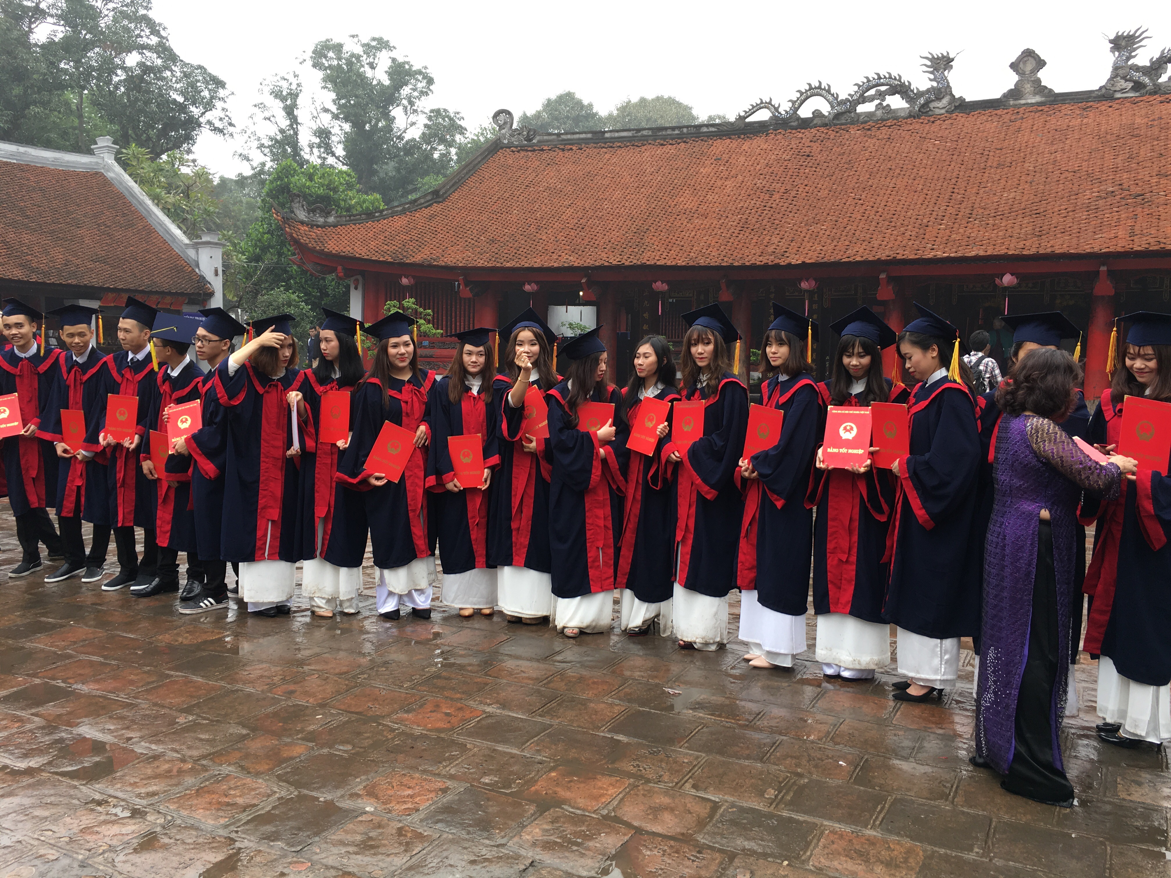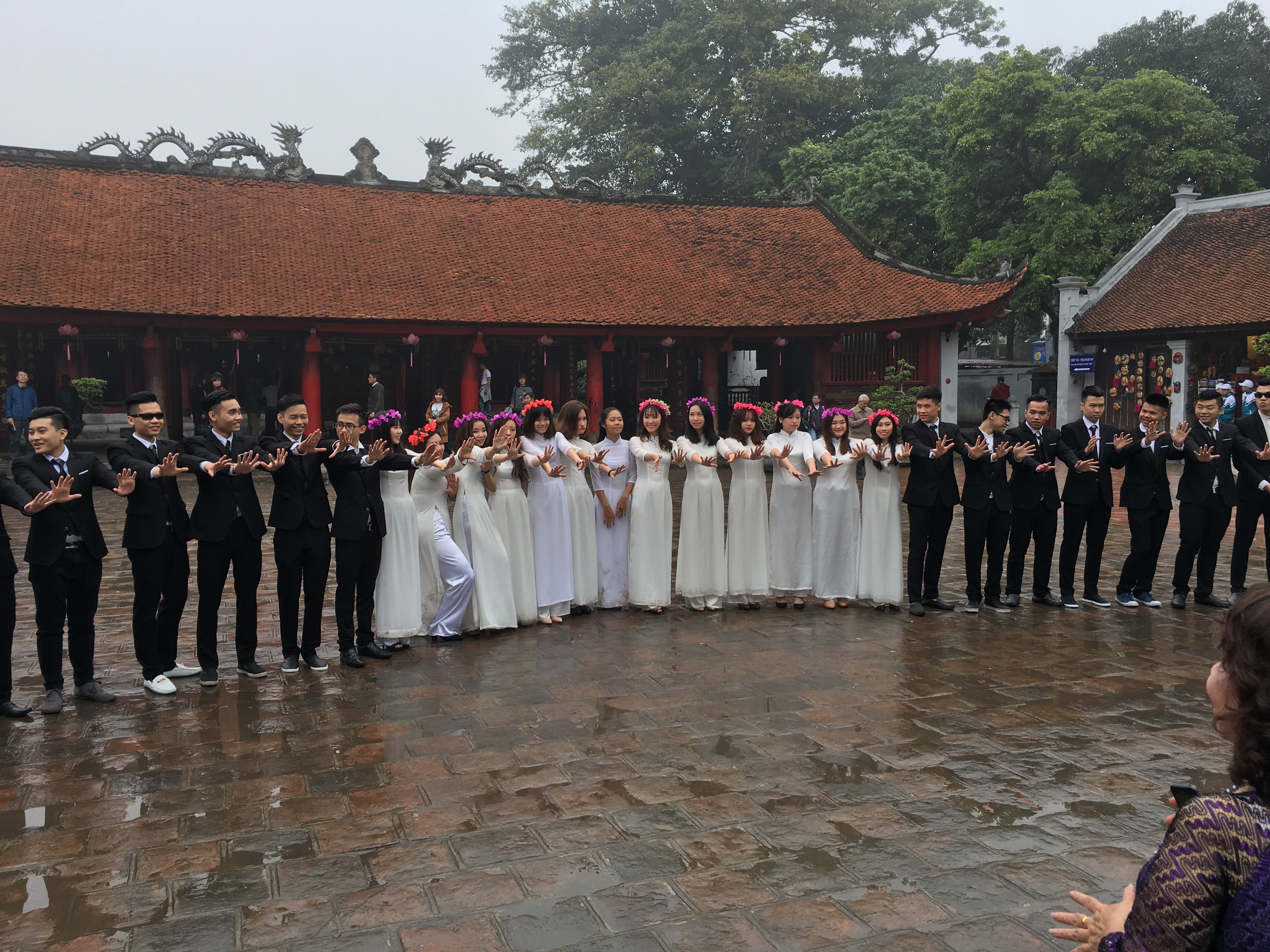 High school graduation photos in the 1,000 year old college that gave doctorates and is now a museum. Notice the white dresses have the side opening with pants underneath, the traditional Vietnamese formal attire. Not sure what the finger gesture means from woman in red. Maybe money coming?