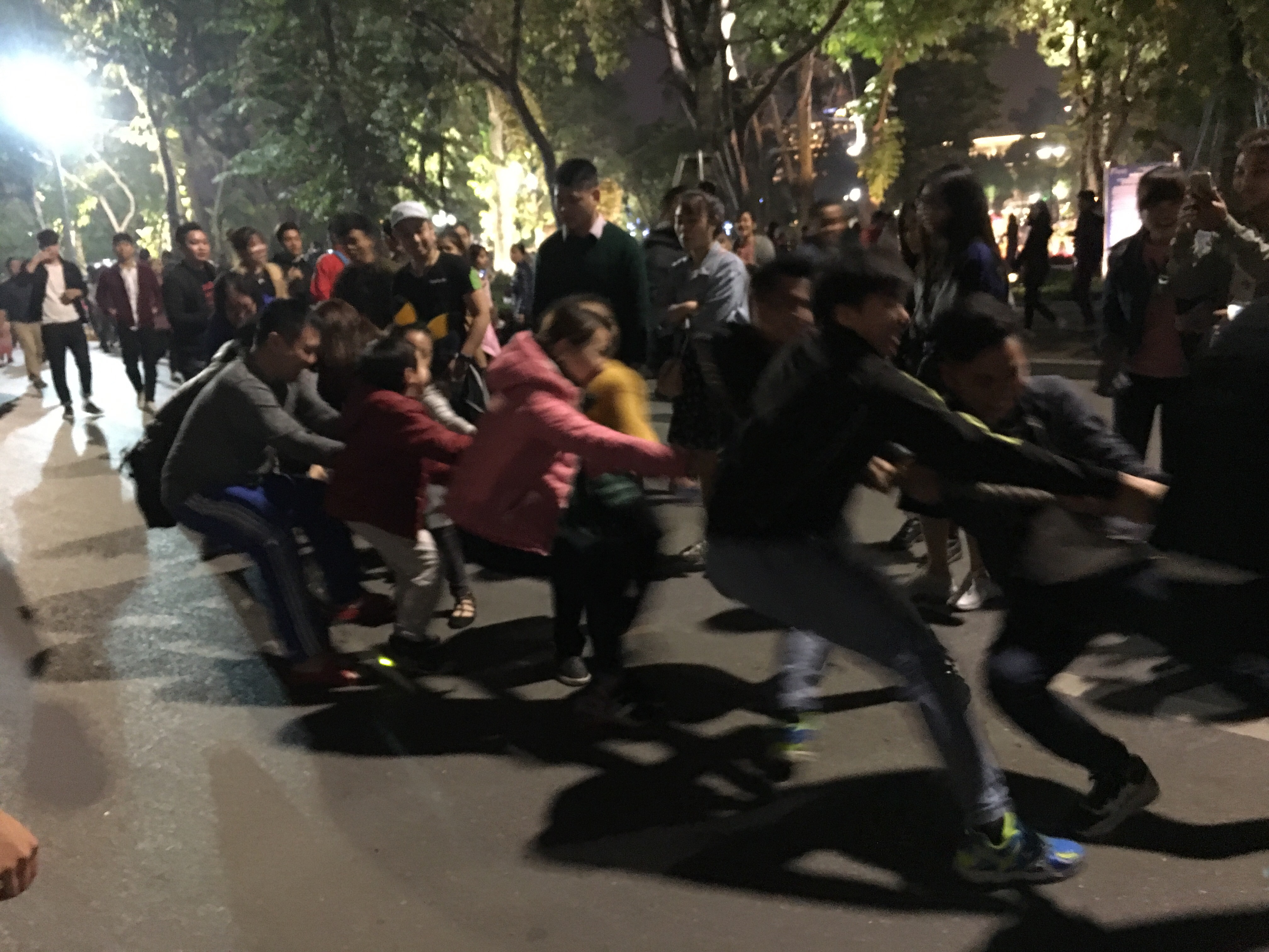 Wonderful atmosphere of games. Tug of war, double Dutch jump rope and variously shaped chalk drawn games with rocks.