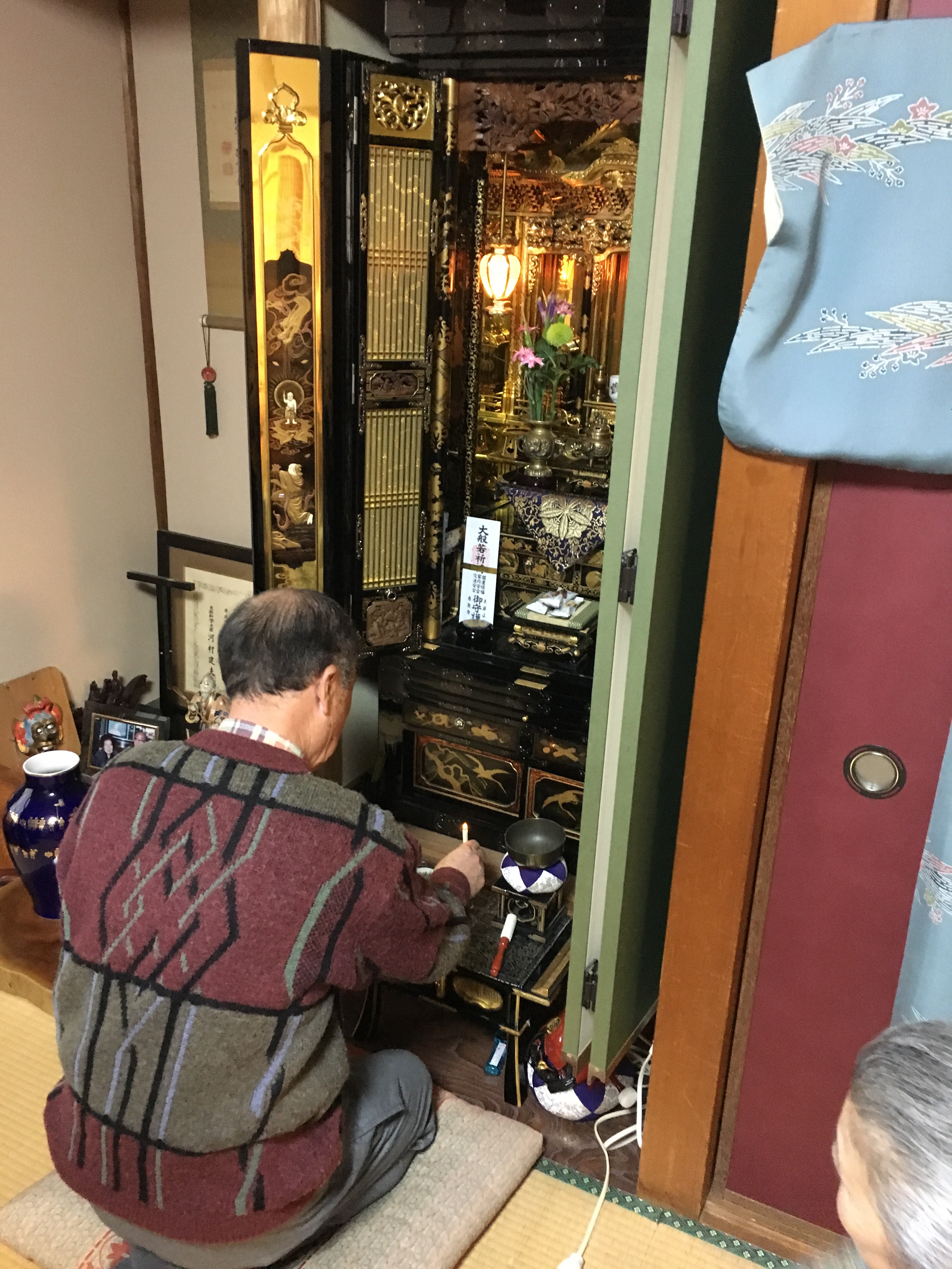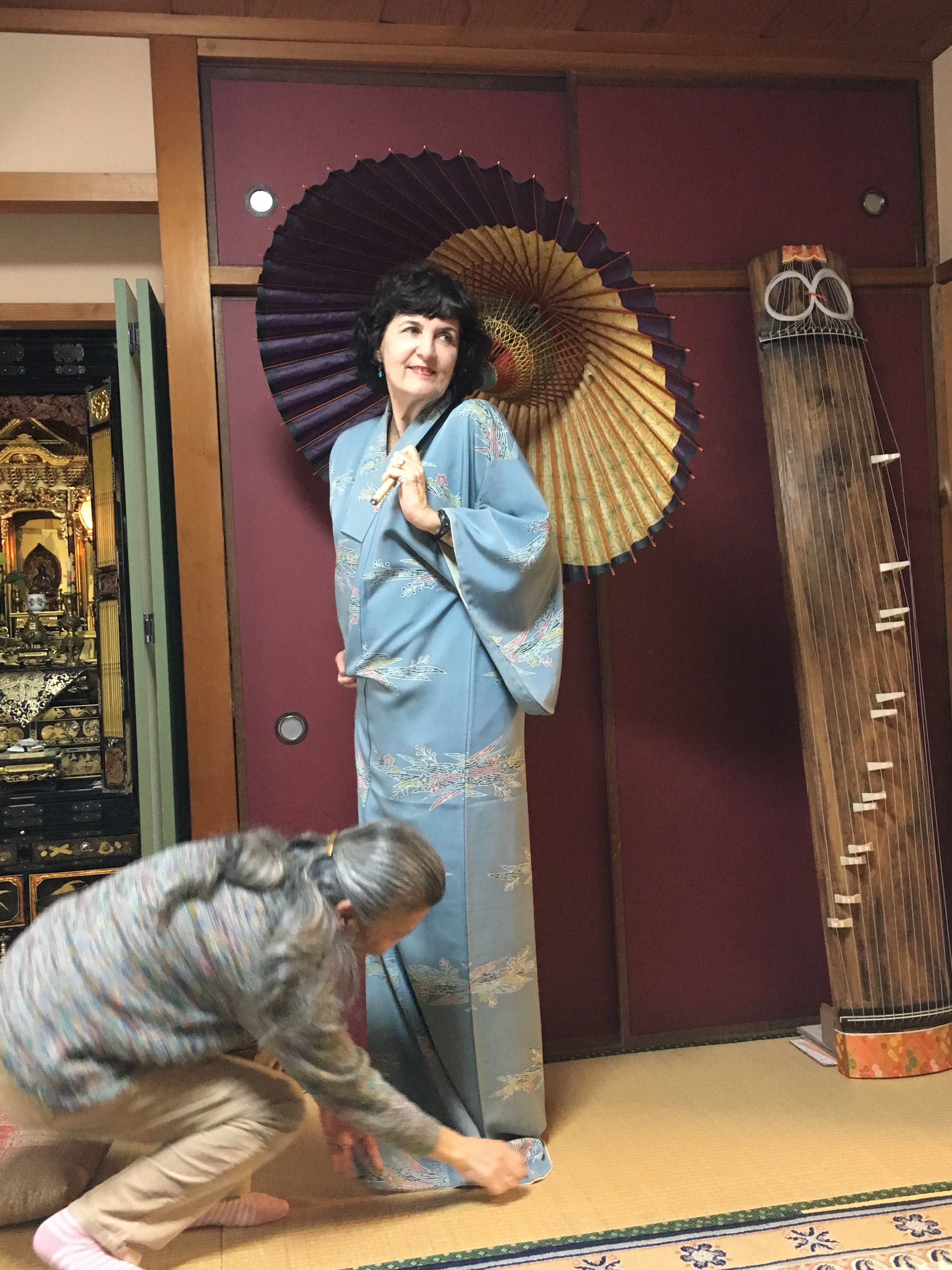 We divided into small groups for a home visit to these retired academics. Notice their favorite departed dog Gage & Jade? She insisted on dressing me in the kimono that her mother and she had each been married in, then serenaded us.