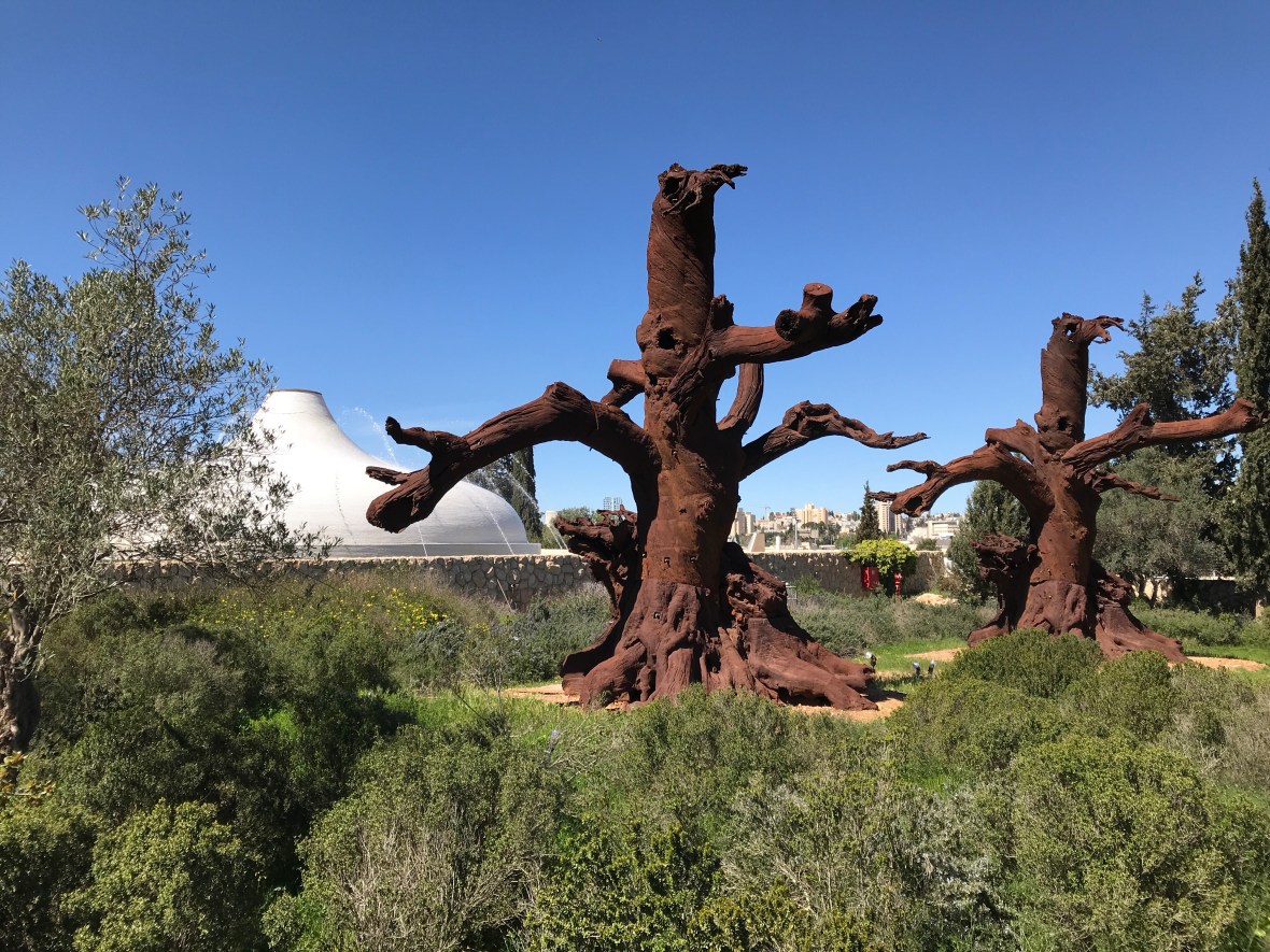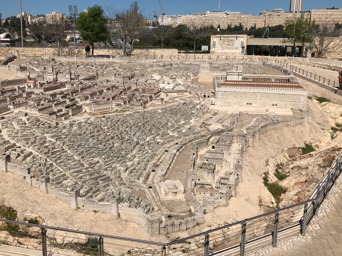 Model of old Jerusalem with city of David outside the walls on lower right. Herod’s Second Temple on the upper platform middle right. The two iron trees below that are by Chinese artist Ai Weiwei with the Shrine of the Book holding Dead Sea Scrolls under the sculpted white roof.