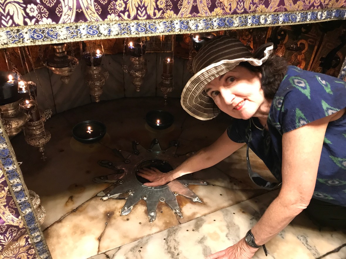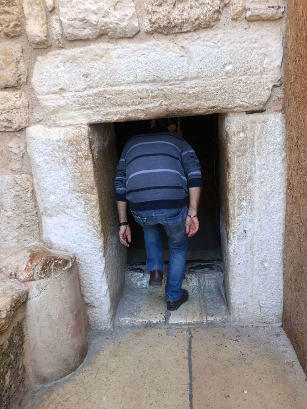 This is in Palestinian Bethlehem, a church built over a cave where Mary gave birth. Only a small part of the stone is exposed in the basement that I touched. The small door to the church is to keep horses and camels out.