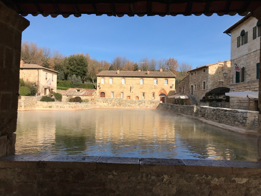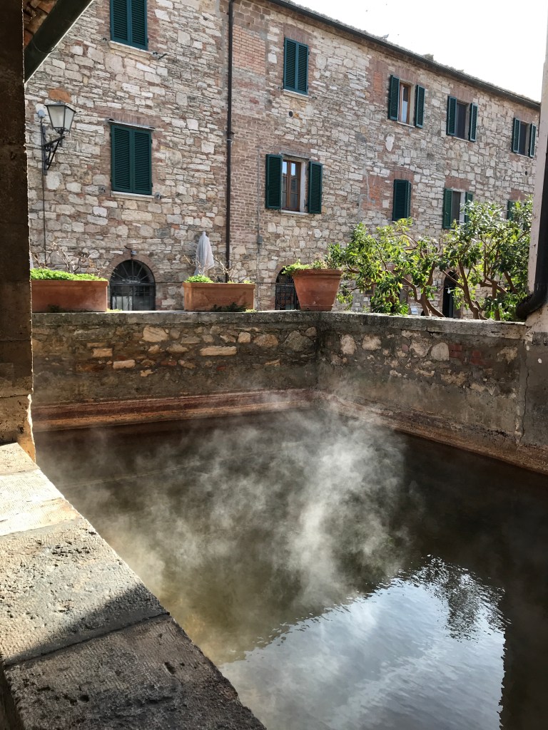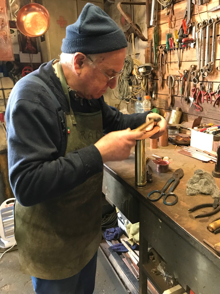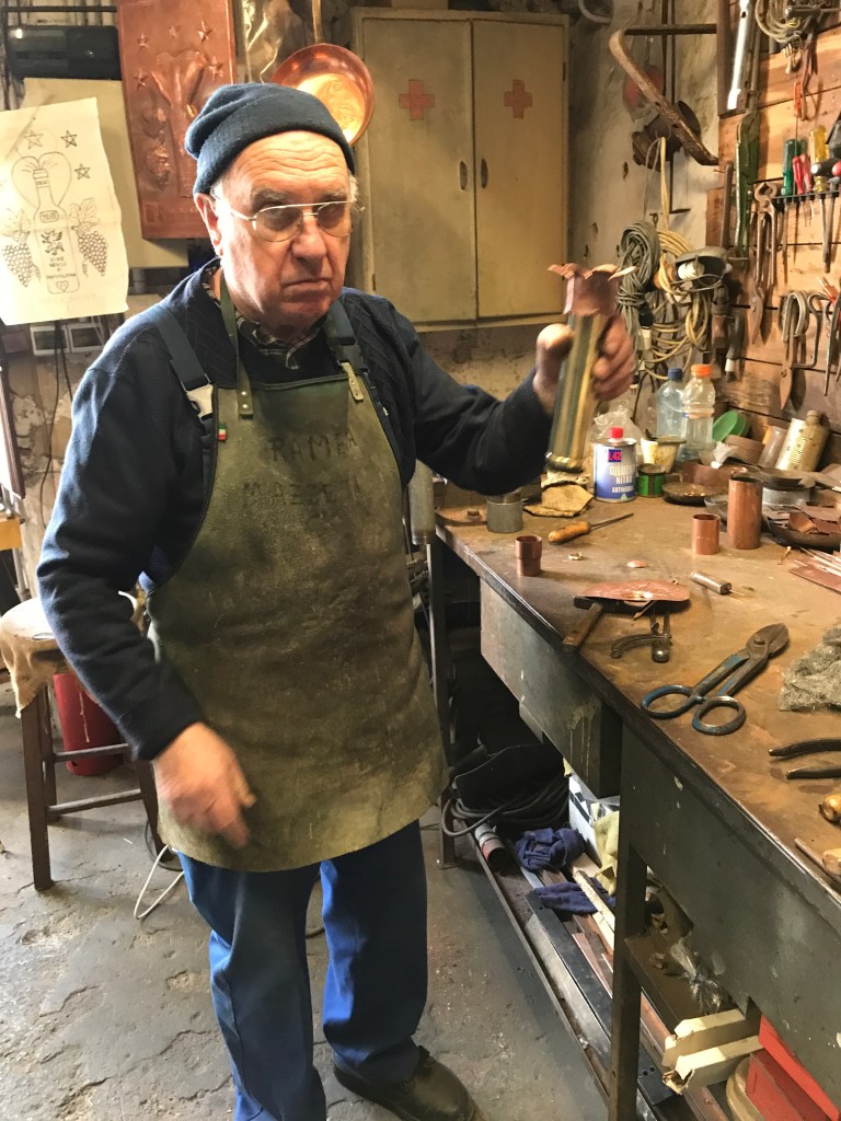 The ancient Bagno is not in use, now a UNESCO site. We visited towns nearby including Montepulciano that Marty thought over-restored. I heard tapping and peeked in a dirty window to see this coppersmith working away.